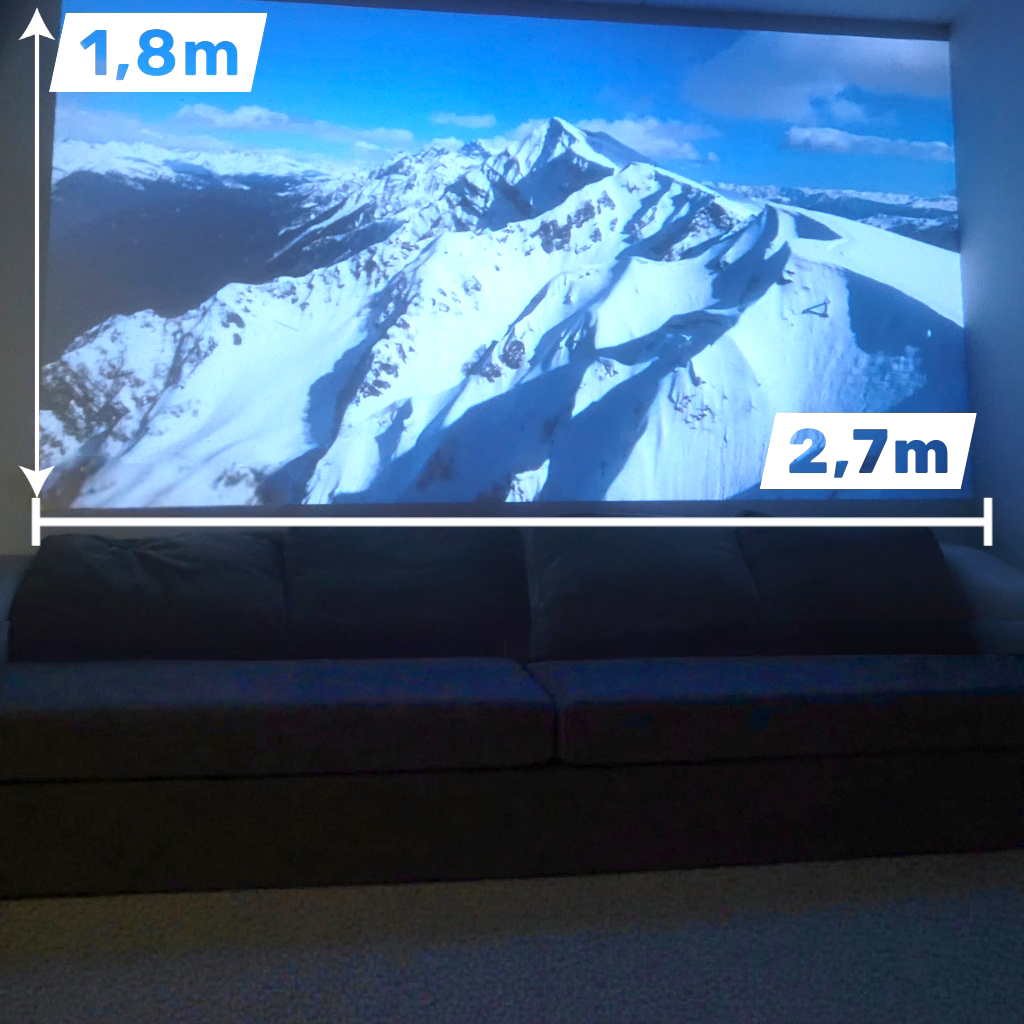 3 méterről is óriási kép, zoommal pedig teljesen testreszabható. Ügyelj arra ,hogy ha kép nagyságát változtatod akkor a fókuszt is. Annyi eltérés van elhelyezés és beállítások között ,hogy nem mondható egy konkrét méret.